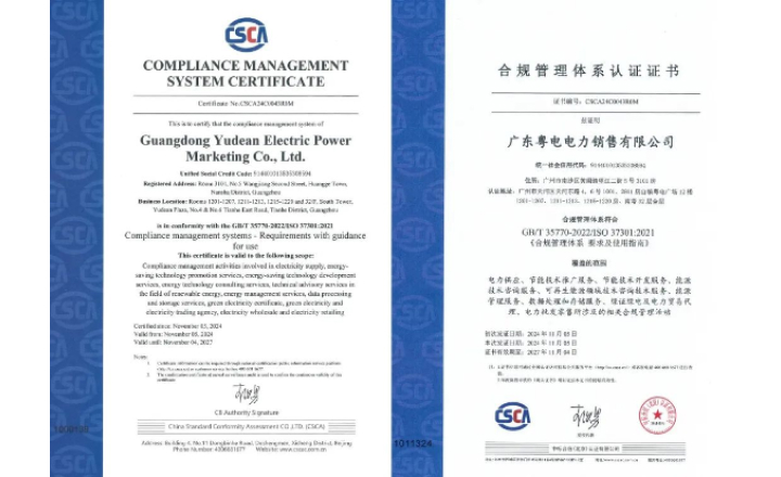 粤电售电公司通过合规管理体系国际国内双标认证